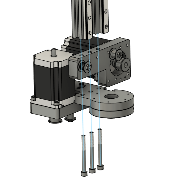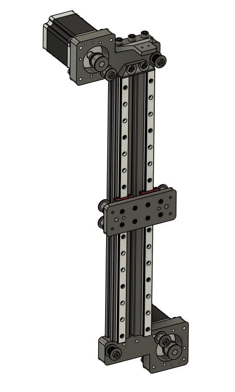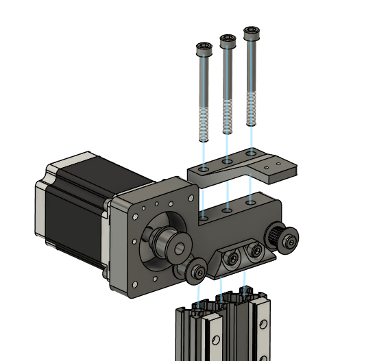 Take the same motor assembly, the Cable carrier bracket, and the assembled vertical rail assembly and bolt the motor assembly using 3x m6x60 bolts to the vertical rail assembly
