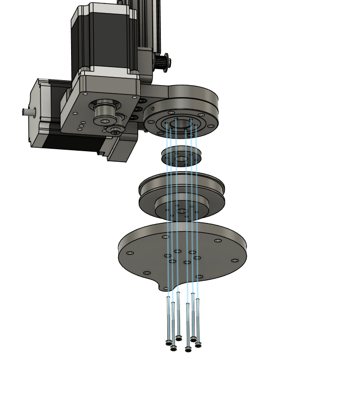Using 6x M3x50 socket head bolts, sandwich the J1 pulley spacer, GT2 120tooth pulley, and the J1 Flange Base Mount and fasten to secure.