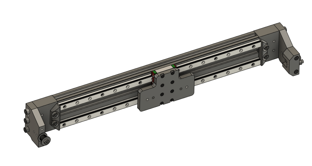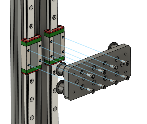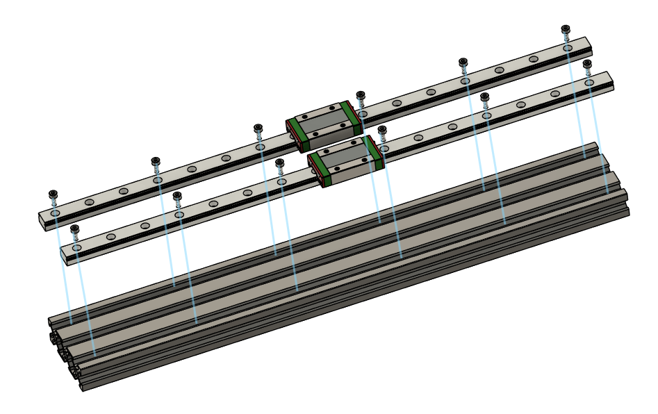 Add 2 Linear rails to one of the 2060 extrusions use m3x8mm socket heads with the drop in t-nuts, place 1 bolt every 4 holes (not really necessary to do all of them)