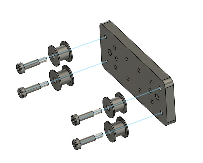 Take the J2 Rail Mount plate and add 4x SMOOTH idler pulleys to the back side of the plate using 4 m4 shoulder bolts